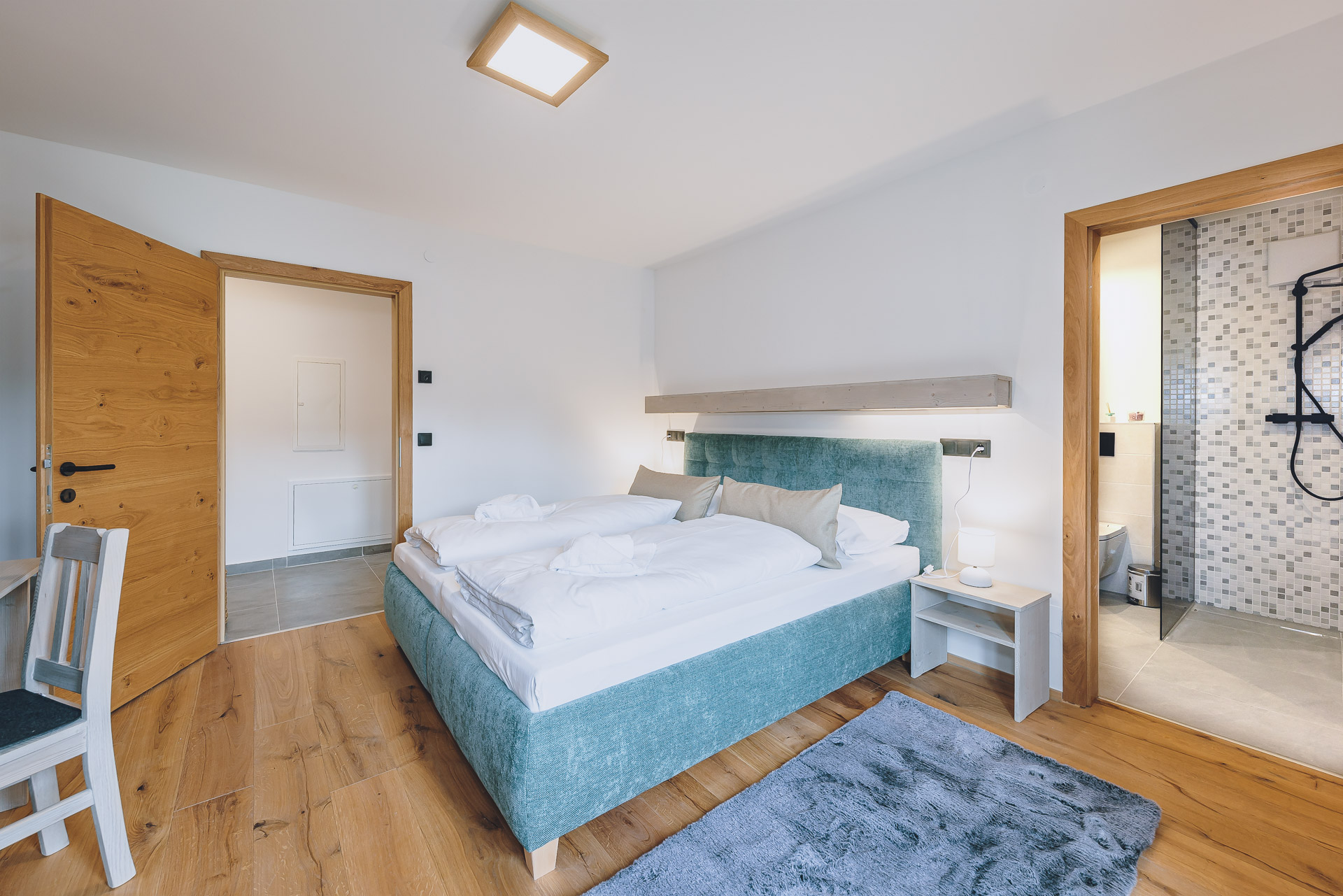 Auf 90 m2 befinden sich zudem 3 Schlafzimmer, die mit Doppelbett, Kleiderschrank und Schreibtisch ausgestattet ist. Außerdem kann man über jedes der Schlafzimmer den Balkon erreichen. Auf diesem wartet ein wunderschöner Ausblick auf die umliegende Bergwelt.